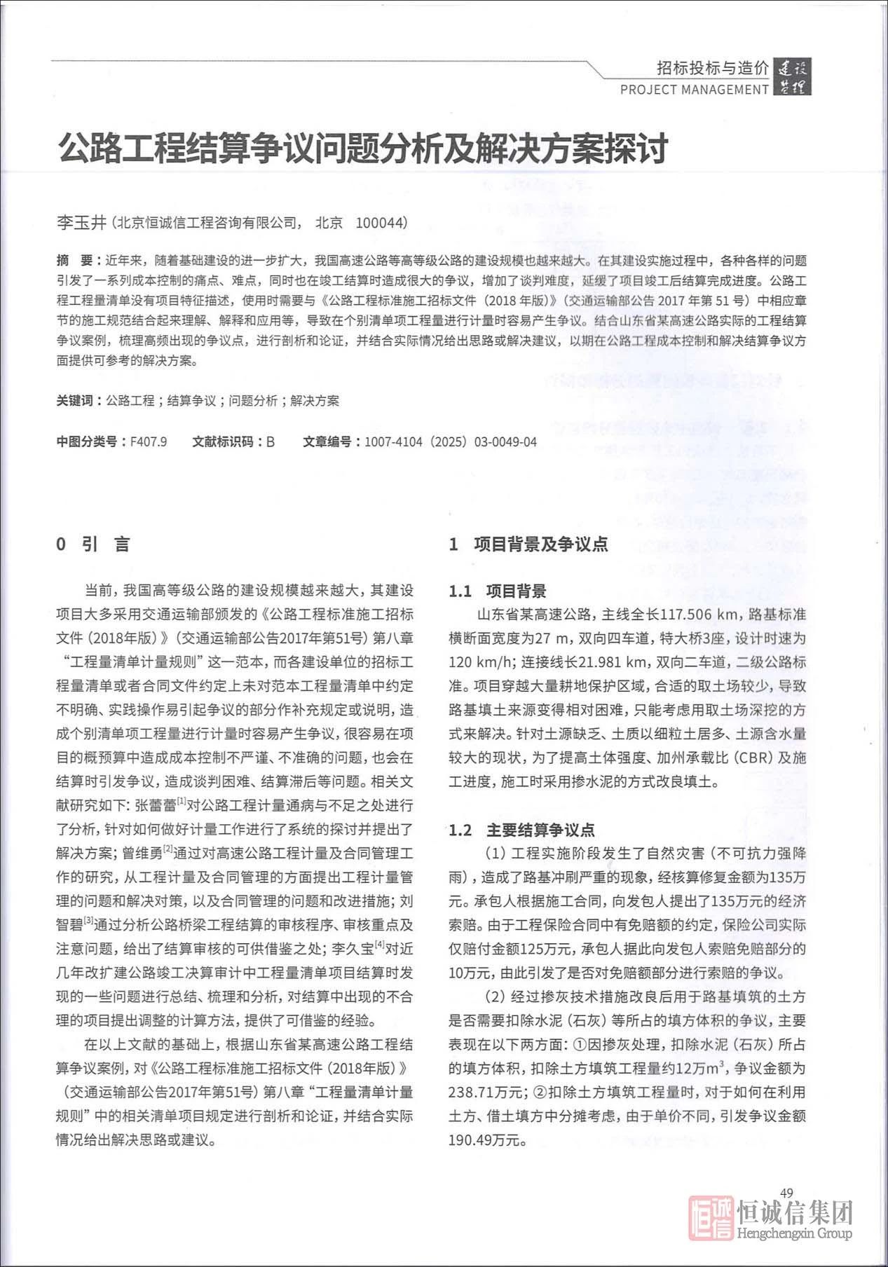 近日,恒誠(chéng)信集團(tuán)技術(shù)部總經(jīng)理李玉井的學(xué)術(shù)成果《公路工程結(jié)算爭(zhēng)議問(wèn)題分析及解決方案探討》在工程建設(shè)領(lǐng)域核心期刊《建設(shè)監(jiān)理》(Project Management)2025年第3期"招標(biāo)投標(biāo)與造價(jià)"專欄正式刊發(fā)。